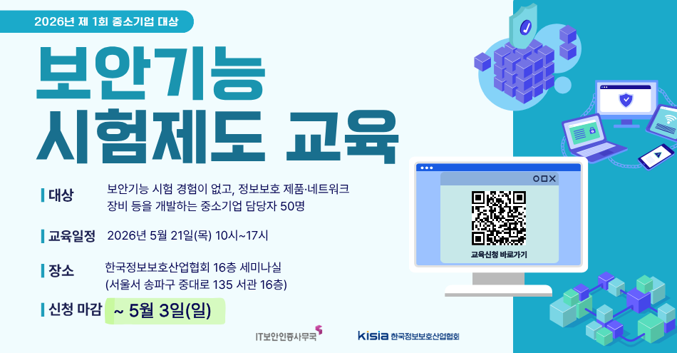 [2026-03-27] [모집중] 2026년 제1회 중소기업대상 보안기능 시험제도 교육생 모집(~5.3)