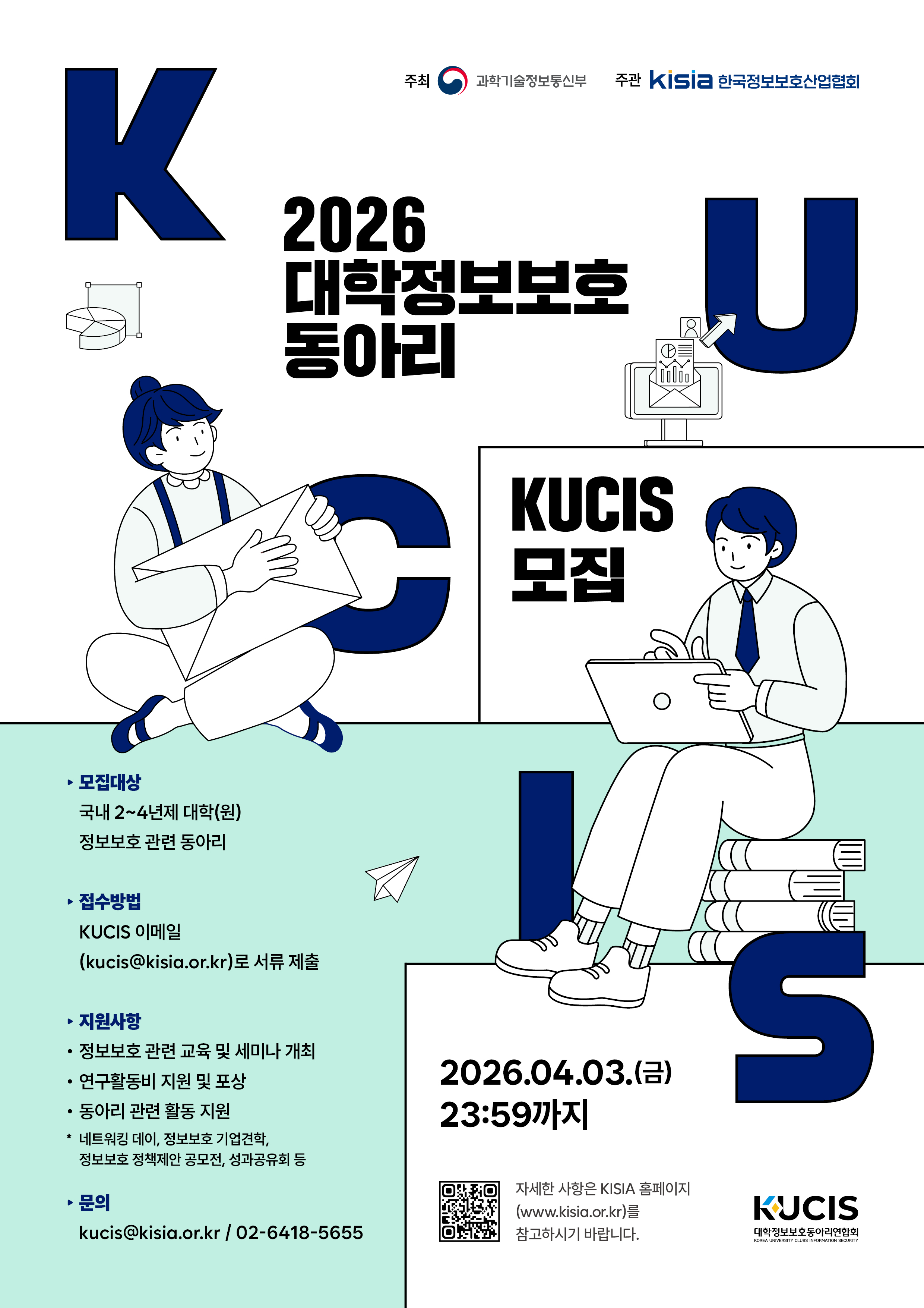 나. 접수안내 ㅇ 신청자격 : 아래의 각 요건을 모두 갖추고 있는 동아리 1) 전국 대학(2~4년제)의 정보보호 관련 동아리 2) 동아리 구성원이 최소 10인 이상인 동아리 3) 지도교수가 배정되어 있는 동아리 4) 연구활동을 위한 공간(동아리실, 연구실 등)을 확보하고 있는 동아리 ㅇ 접수기간(세부사항은 붙임자료 참고) : ~ '26. 4. 3.(금) 23:59까지 ㅇ 접수방법 : KUCIS 이메일(kucis@kisia.or.kr)로 서류 제출
