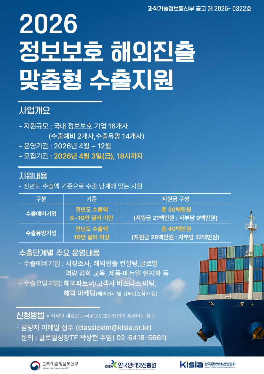 협회는 국내 정보보호 기업의 글로벌 시장 진출과 수출 실적 달성을 위해 마케팅 및 현지화 등 전반적 해외진출 활동을 지원하고자 하여 참가기업을 모집하오니 많은 관심과 참가신청 바랍니다.