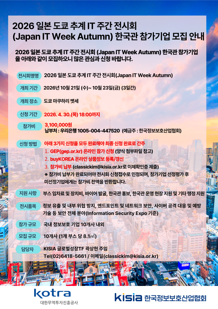 KOTRA와 한국정보보호산업협회는 2026년 10월 21일 ~ 10월 23일 (3일간) 일본 도쿄에서 개최되는 ‘2026 일본 도쿄 추계 IT 주간 전시회 (Japan IT Week Autumn) 한국관 참가기업'을 아래와 같이 모집하오니 관심기업들의 많은 신청 바랍니다.