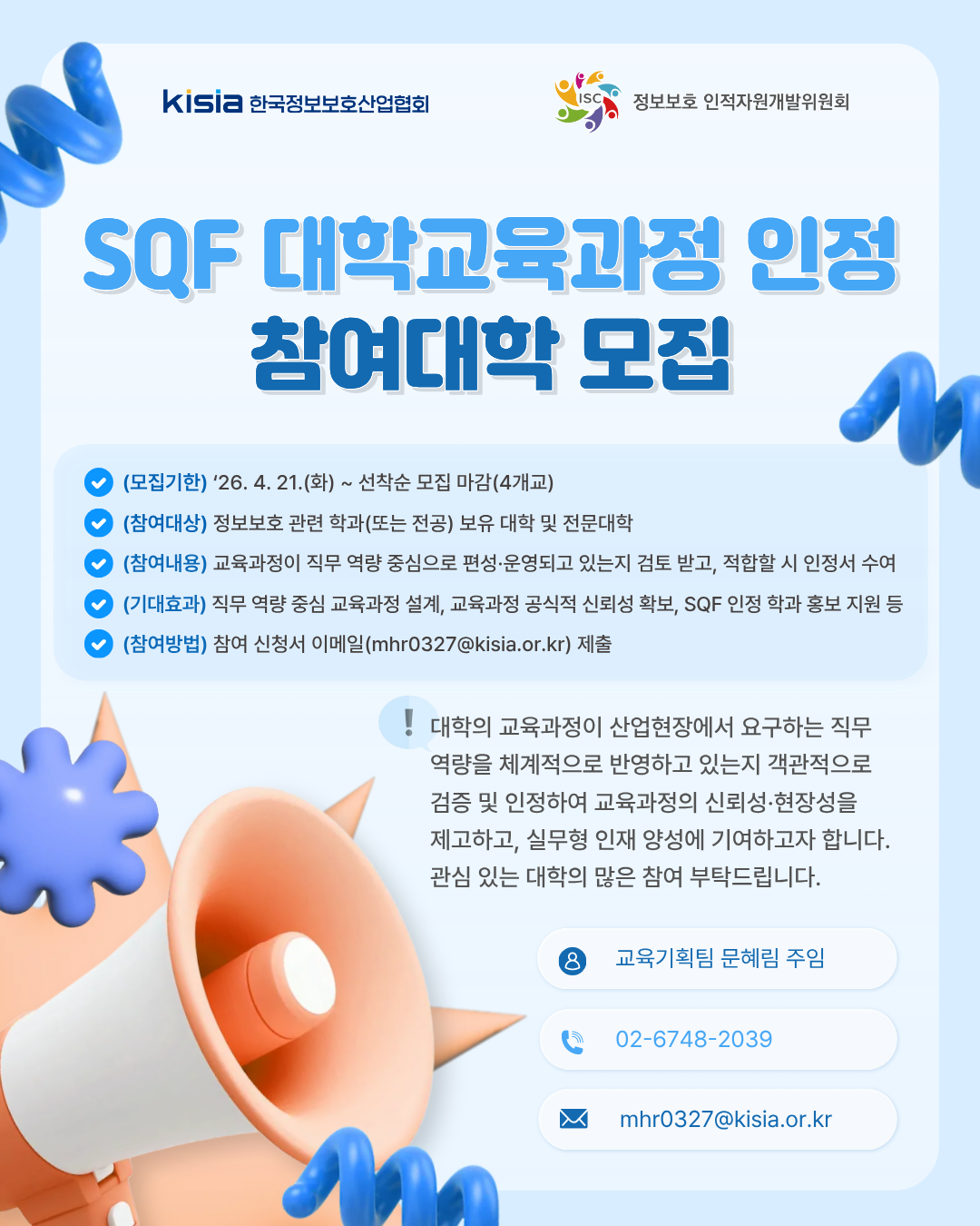 안녕하세요. 정보보호ISC입니다. 정보보호ISC에서는 대학·전문대학의 교육과정이 산업현장에서 요구하는 직무역량을 체계적으로 반영하고 있는지 객관적으로 검증·인정하는 「SQF 대학교육과정 인정」 사업을 추진하고 있습니다. 이에 따라 본 사업에 참여할 대학을 모집하오니 관심 있는 대학의 많은 참여를 부탁드립니다. 첨부파일을 확인해보시고, 참여를 희망하시는 경우 [양식] SQF 대학교육과정 인정 사업 참여 신청서 및 첨부서류를 작성하여 메일(mhr0327@kisia.or.kr)로 송부해주시기 바랍니다.