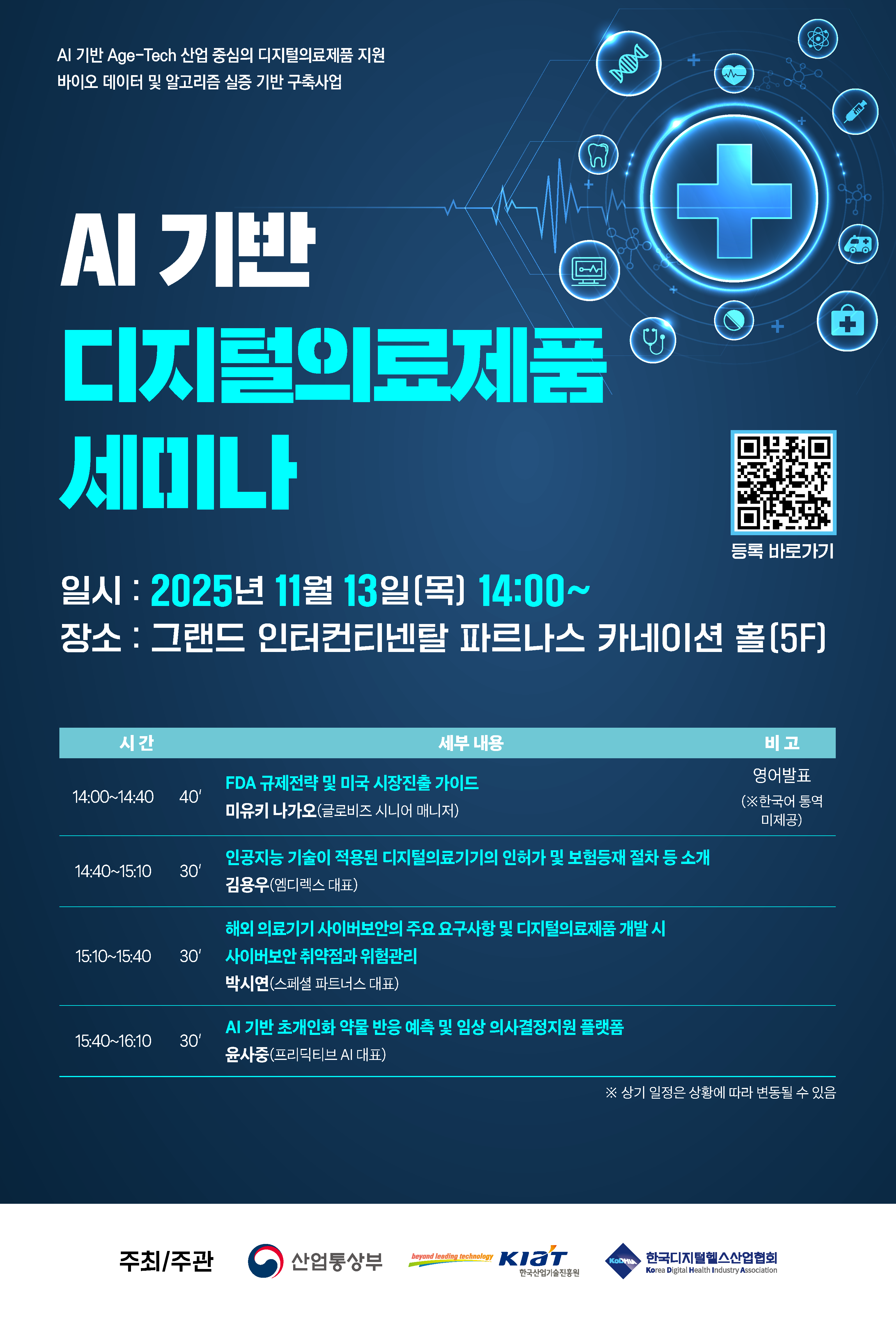 | 제목 | [KoDHIA] AI 기반 Age-Tech 디지털의료제품 세미나 개최 (11.13(목)) | ||