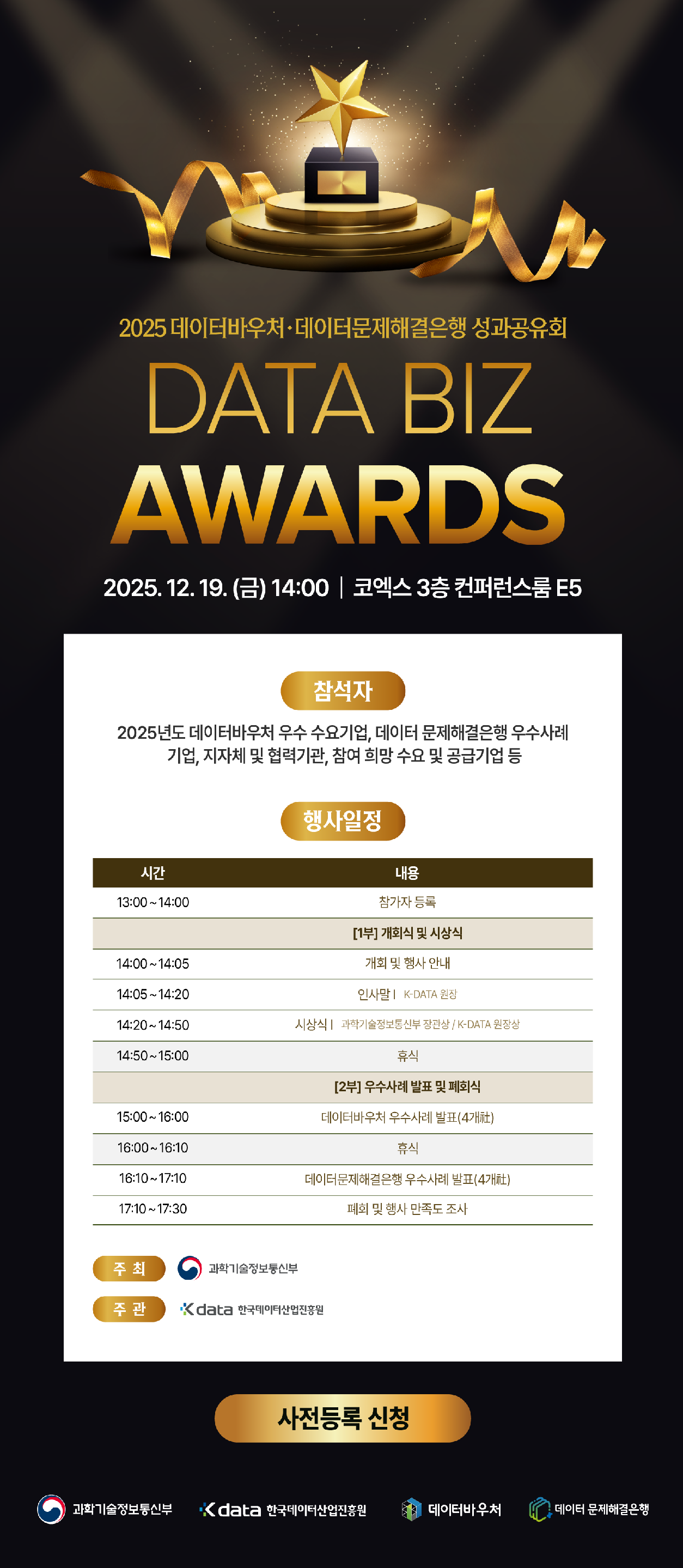 안녕하세요! 한국데이터산업진흥원입니다. 오는 12.19(금) 14시부터 서울 코엑스에서 '2025 데이터바우처·데이터 문제해결은행 성과공유회'가 예정되어 있습니다. 한 해 동안의 사업 성과를 돌아볼 수 있는 뜻 깊은 자리에 기관 직원분들의 많은 관심과 참석 부탁드립니다. --------------------------------------------------------------------------------------------------------------------------- □ 행사 개요 ○ (행 사 명) 2025 데이터바우처·데이터 문제해결은행 성과공유회, “Data Biz Awards” ○ (일시/장소) 2025. 12. 19.(금) 14:00~17:30, 코엑스 컨퍼런스룸 E5 ○ (주요내용) ’25년도 데이터바우처 지원사업 및 데이터 문제해결은행 우수사례 발표·공유 및 시상 ○ (주최/주관) 과학기술정보통신부/한국데이터산업진흥원(K-DATA)