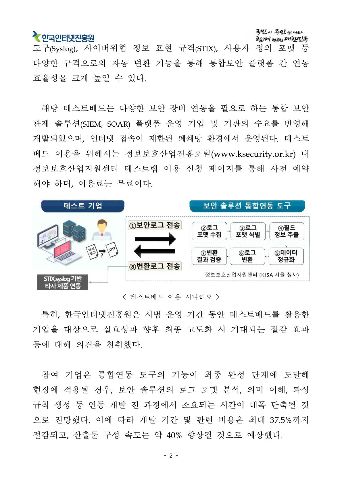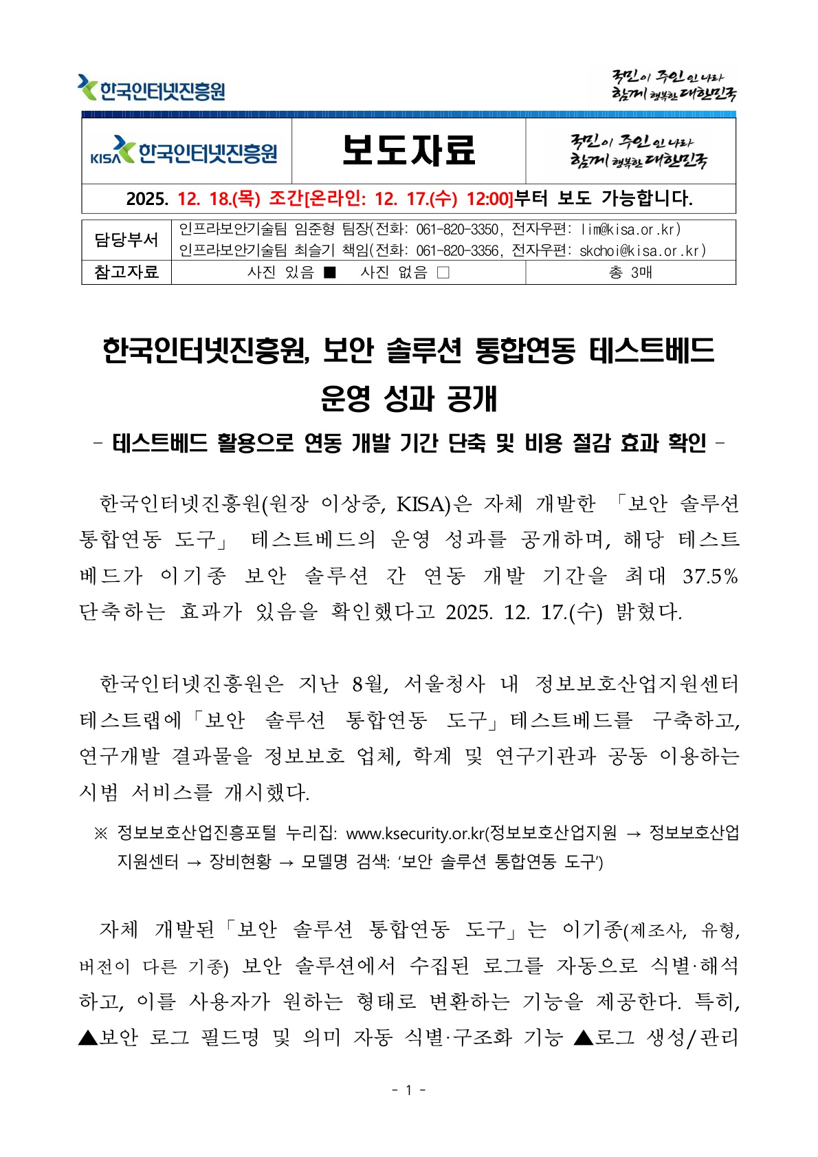보안 솔루션 통합연동 테스트베드 운영 성과 공개 서울 청사 내 정보보호산업지원센터 테스트랩에 「보안 솔루션 통합 연동 도구」테스트베드가 구축되었습니다.