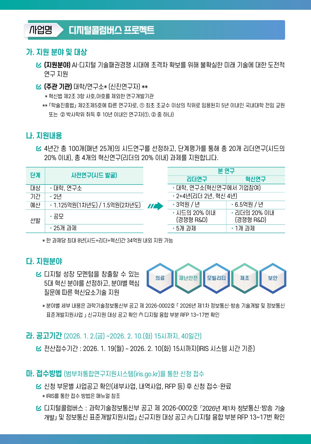 ○ 지원분야 : AI·디지털 기술패권경쟁 시대에 초격차 확보를 위해 불확실한 미래 기술에 대한 도전적 연구 지원(의료, 재난안전, 모빌리티, 제조, 보안) ○ 공고기간 : 26.1.2(금) ~ 2.10(화) / 15시까지(IRIS 시스템 시간 기준) ○ 접수 방법 : 신청 부분별 사업공고 확인(세부사업, 내역사업, RFP 등) 후 신청 접수·완료