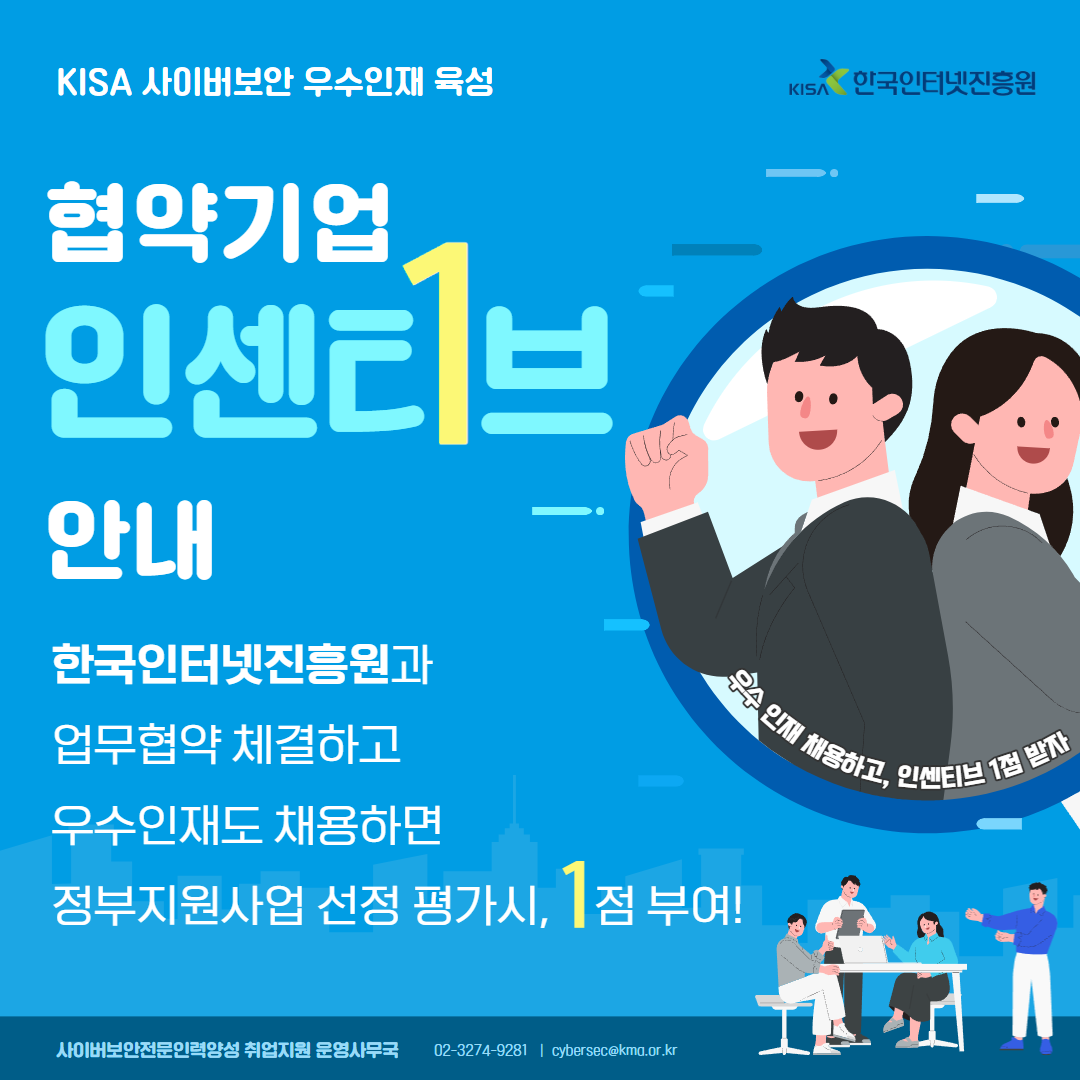 안녕하세요. 한국인터넷진흥원(KISA)은 사이버보안 산업계의 인력난 해소와 인재 선순환 구조 마련을 목표로, 사이버보안인력양성 과정을 통해 배출된 우수 수료생의 취업을 지원하고 있습니다. 이를 기반으로 다수 정보보호 및 보안기업과 '사이버보안 우수인재 육성 및 산업계 상생협력'을 위한 업무협약(MOU)를 체결해왔으며, 협약기업과의 협력을 더욱 강화하고, 기업의 실질적인 참여를 유도하기 위해 신규 인센티브 방안을 아래와 같이 도입하여 안내드립니다. --------------------------------------------------------- ■ 인센티브 방안 소개