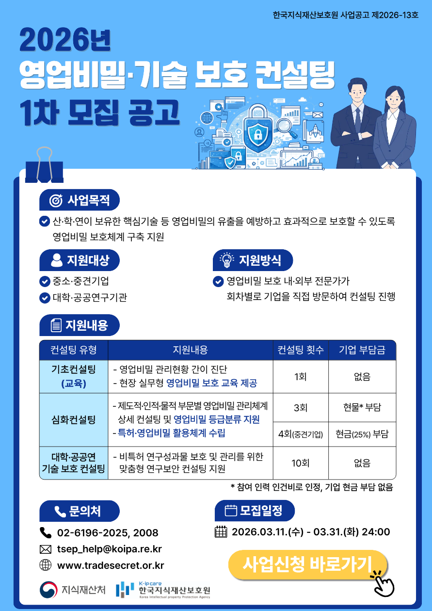 | 제목 | [한국지식재산보호원] 2026년 영업비밀·기술 보호 컨설팅 1차 모집 안내(~3.31.(화)) | ||