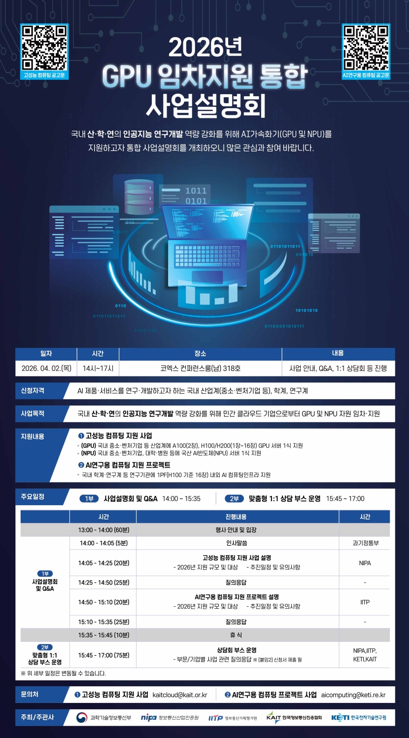 과학기술정보통신부, 정보통신산업진흥원과 함께 한국정보통신진흥협회는 인공지능 산업발전을 위해 인공지능 개발·추론에 필수적인 연산자원과 개발환경을 지원하는 2026년 고성능 컴퓨팅 자원 이용을 희망하는 신청자(기업 등)를 모집하오니, 많은 신청 바랍니다.