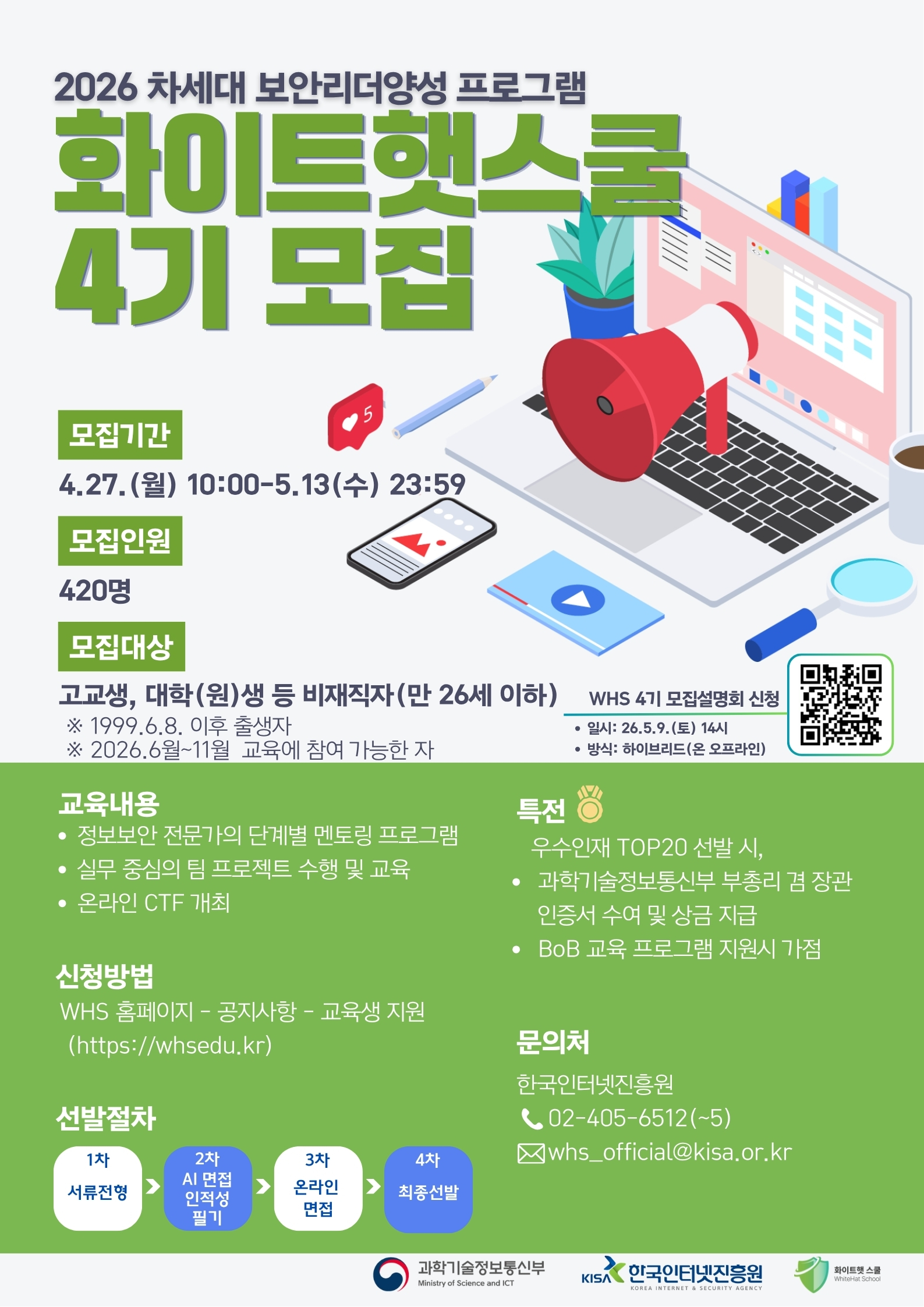 과학기술정보통신부와 한국인터넷진흥원에서는 만 26세 이하 청년을 대상으로 중급 정보보호 전문가 양성을 위한 화이트햇스쿨 4기 교육생을 모집합니다! 정보보호 분야 진출을 희망하는 청년들의 많은 관심과 참여 부탁드립니다. o 모집기간 - 2026.4.27.(월) 10시 ~5.13.(수) 자정 o 모집대상 o 교육기간 o 모집인원 o 교육내용 o 신청방법 o 교육문의