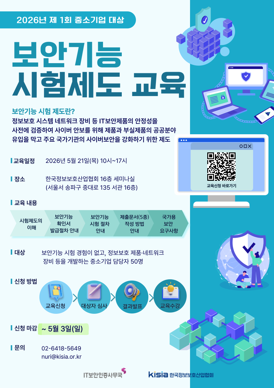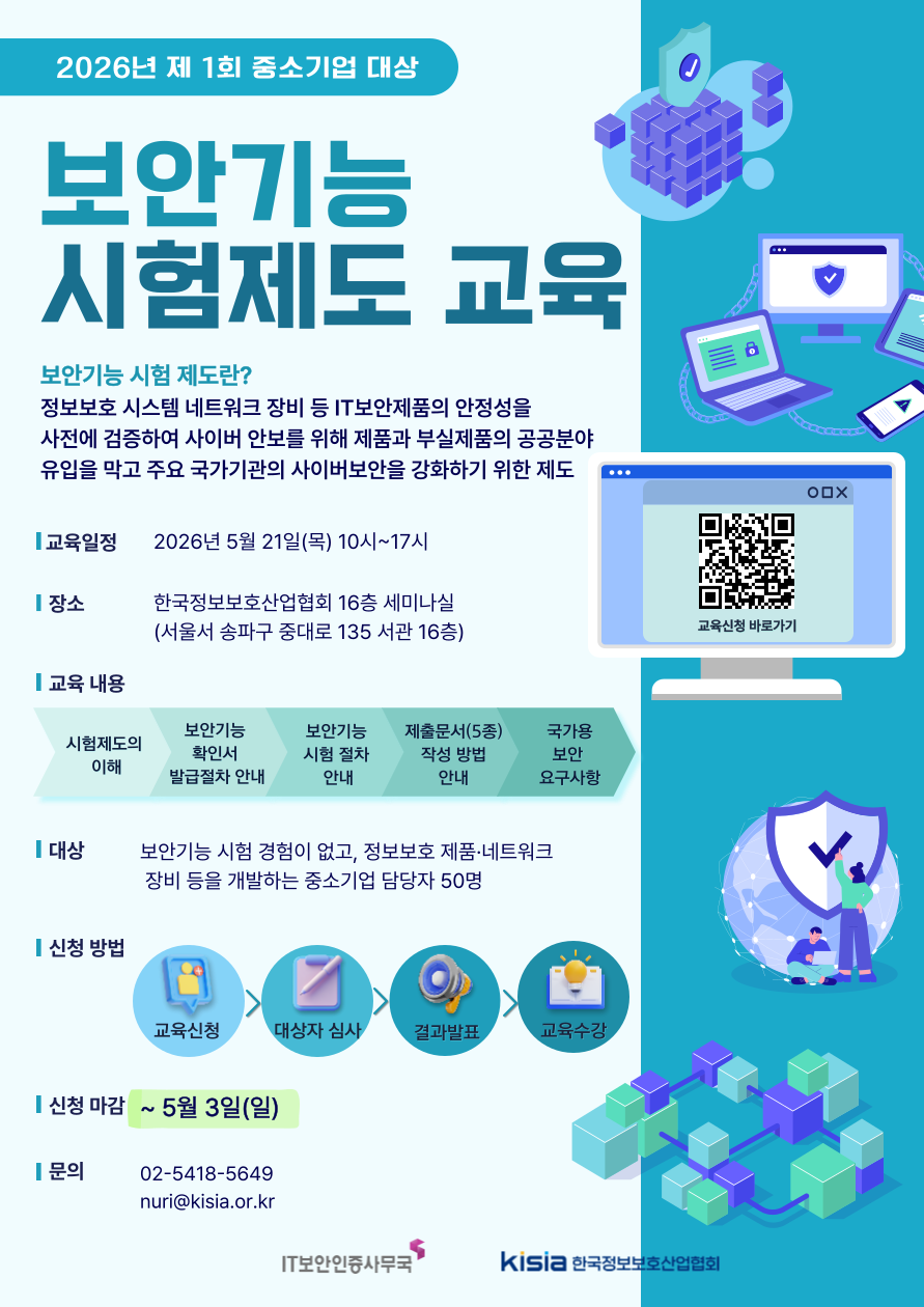 | 제목 | [모집중] 2026년 제1회 중소기업대상 보안기능 시험제도 교육생 모집(~5.3) | ||