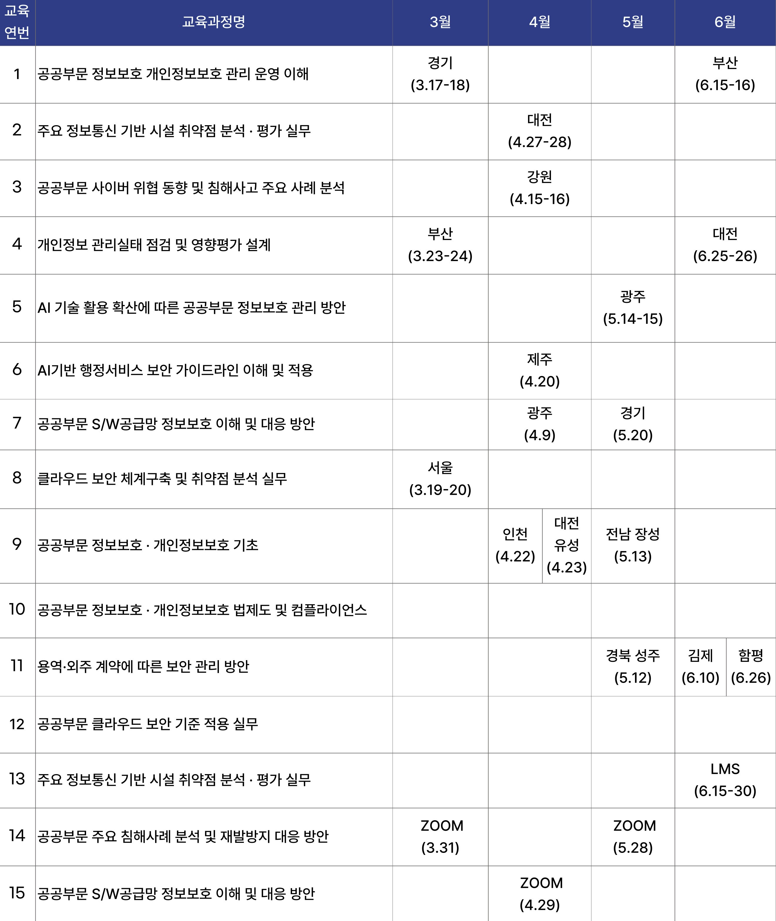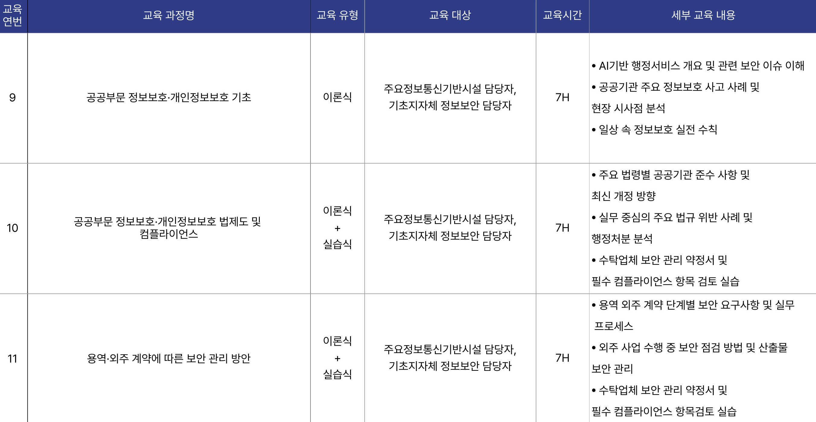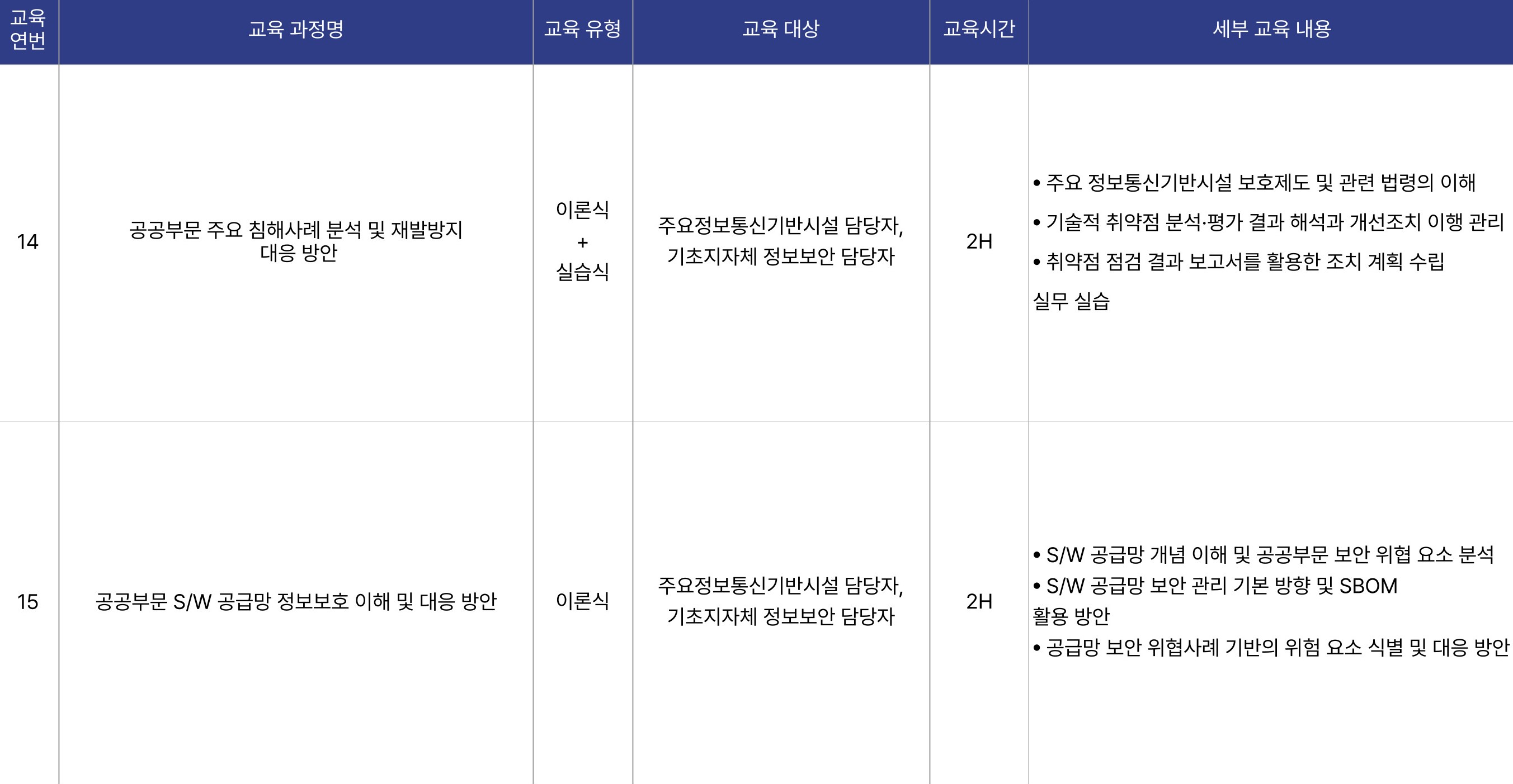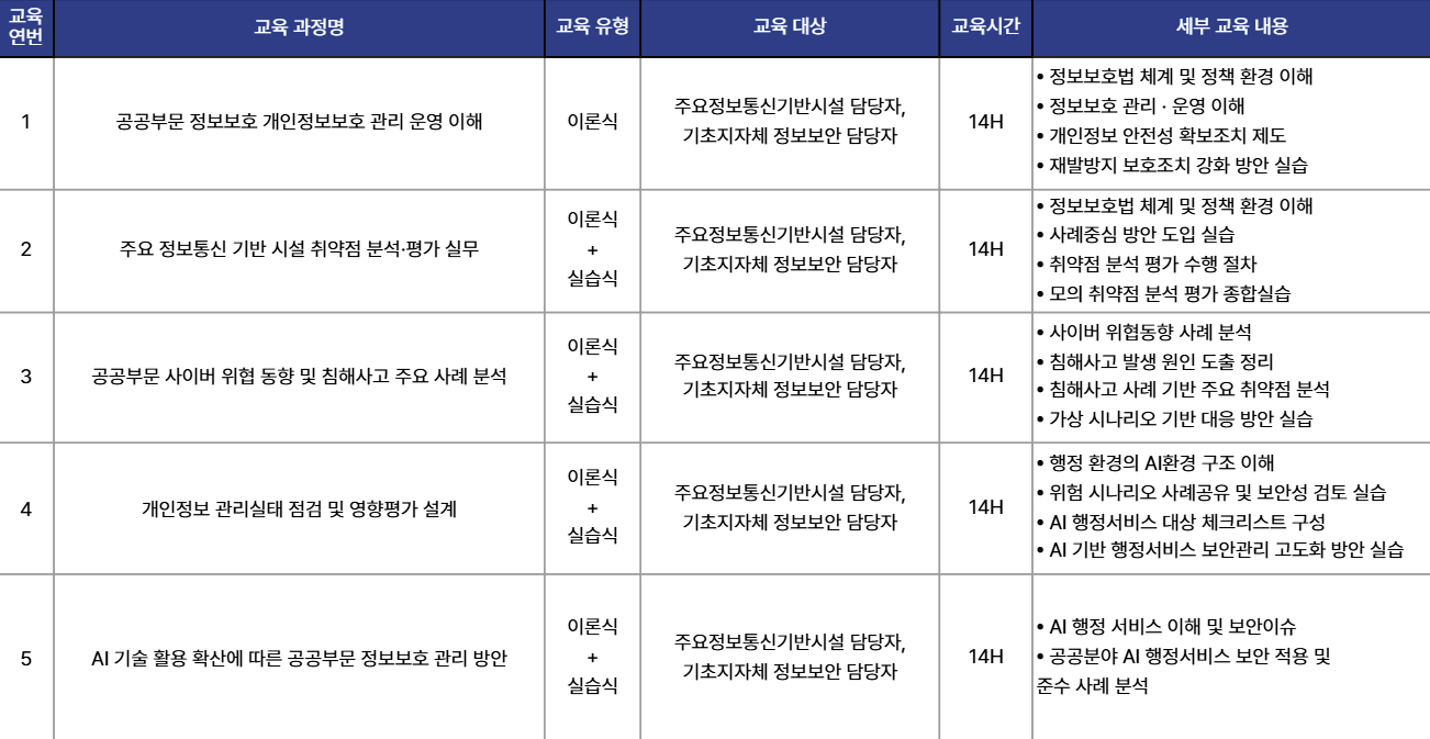 ⦁ (주요 내용) 2026년 지자체 정보통신기반시설 정보보호 컨설팅 사업과 연계한 지자체/공공기관 대상 정보보호 과정 개발 및 교육 운영