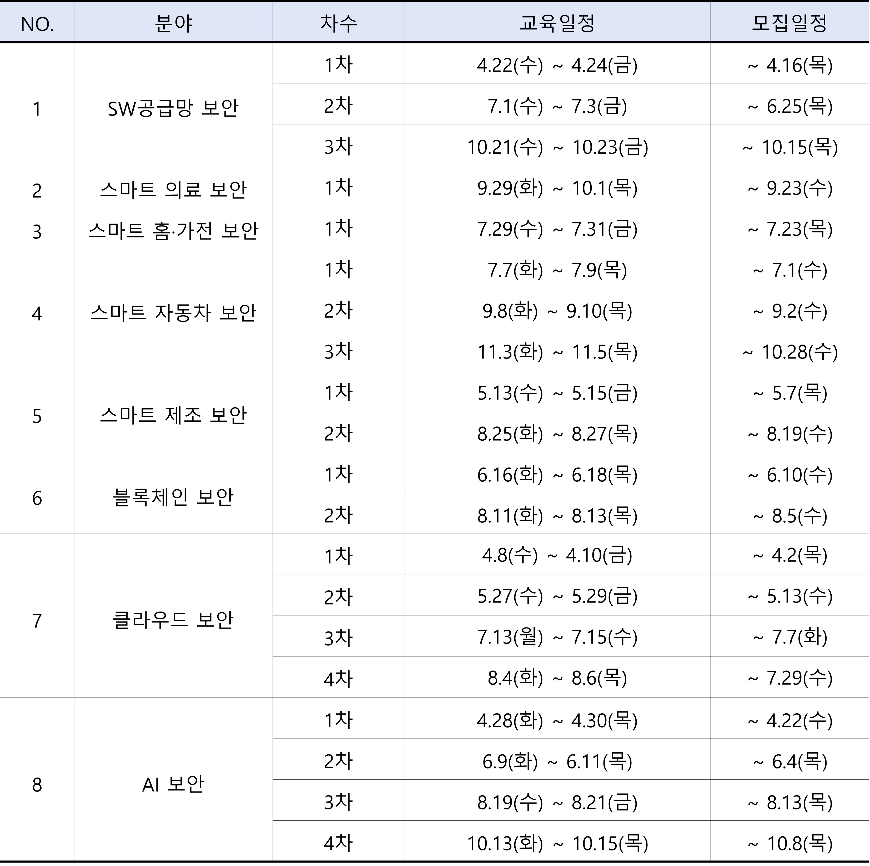 스마트 자동차 · 스마트 제조 · 스마트 홈·가전 · 스마트 의료 · 블록체인 · 클라우드 · SW공급망 · AI보안 등 총 8개 분야 전문 교육 |