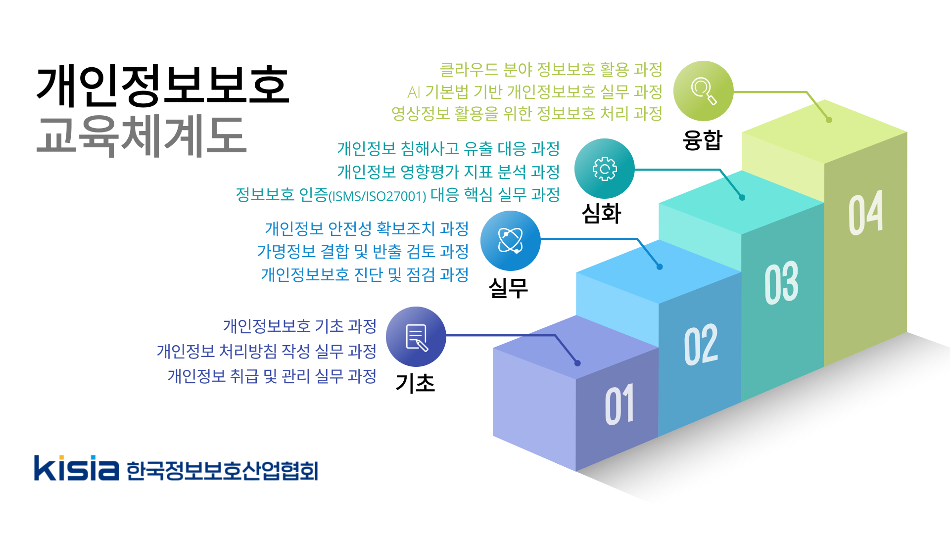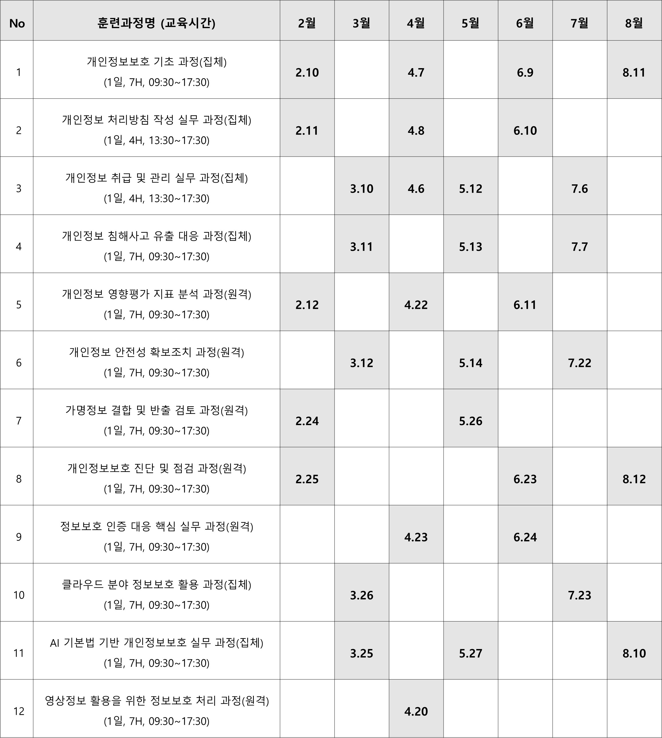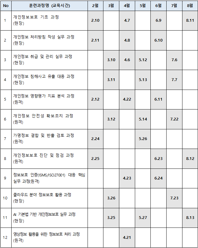 ⦁ (총 12개 과정) 개인정보보호 기초과정(집체교육), 개인정보 처리방침 작성 실무 과정(집체교육), 개인정보 취급 및 관리 실무 과정(집체교육), 개인정보 침해사고 유출 대응 과정(집체교육), 개인정보 영향평가 지표 분석 과정(원격교육), 개인정보 안전성 확보조치 과정(원격교육), 가명정보 결합 및 반출 검토 과정(원격교육), 개인정보보호 진단 및 점검 과정(원격교육), 정보보호 인증(ISMS/ISO27001) 대응 핵심 실무 과정(원격교육), 클라우드 분야 정보보호 활용 과정(집체교육), AI 기본법 기반 개인정보보호 실무 과정(집체교육), 영상정보 활용을 위한 정보보호 처리과정(원격교육)