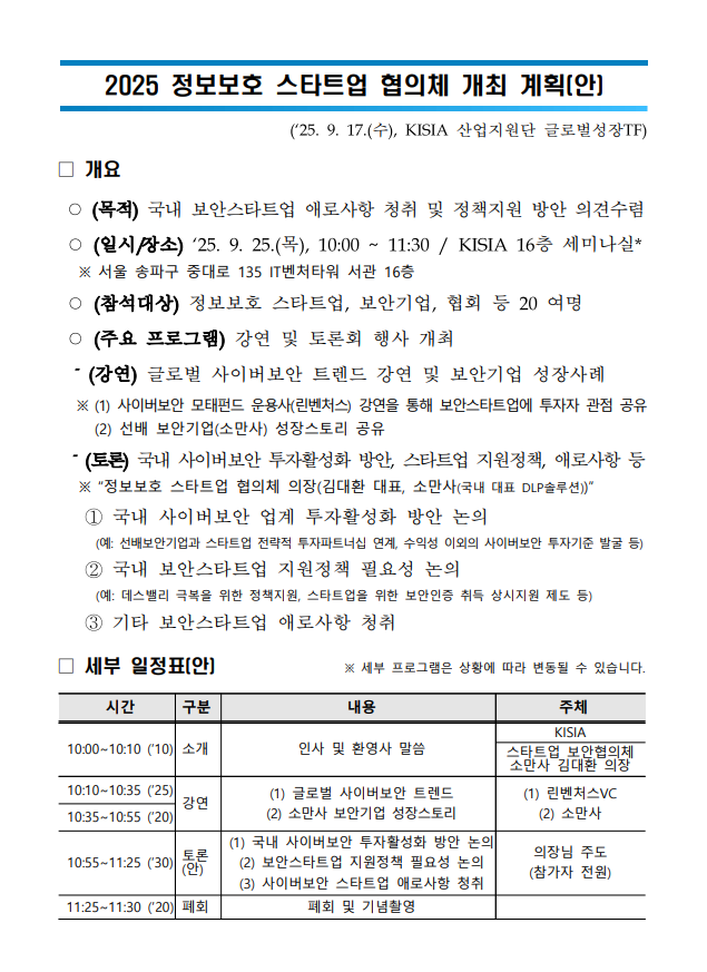 국내 보안스타트업 애로사항 청취 및 정책지원 방안 의견수렴을 위한 『2025 정보보호 스타트업 협의체』가 개최될 예정입니다.