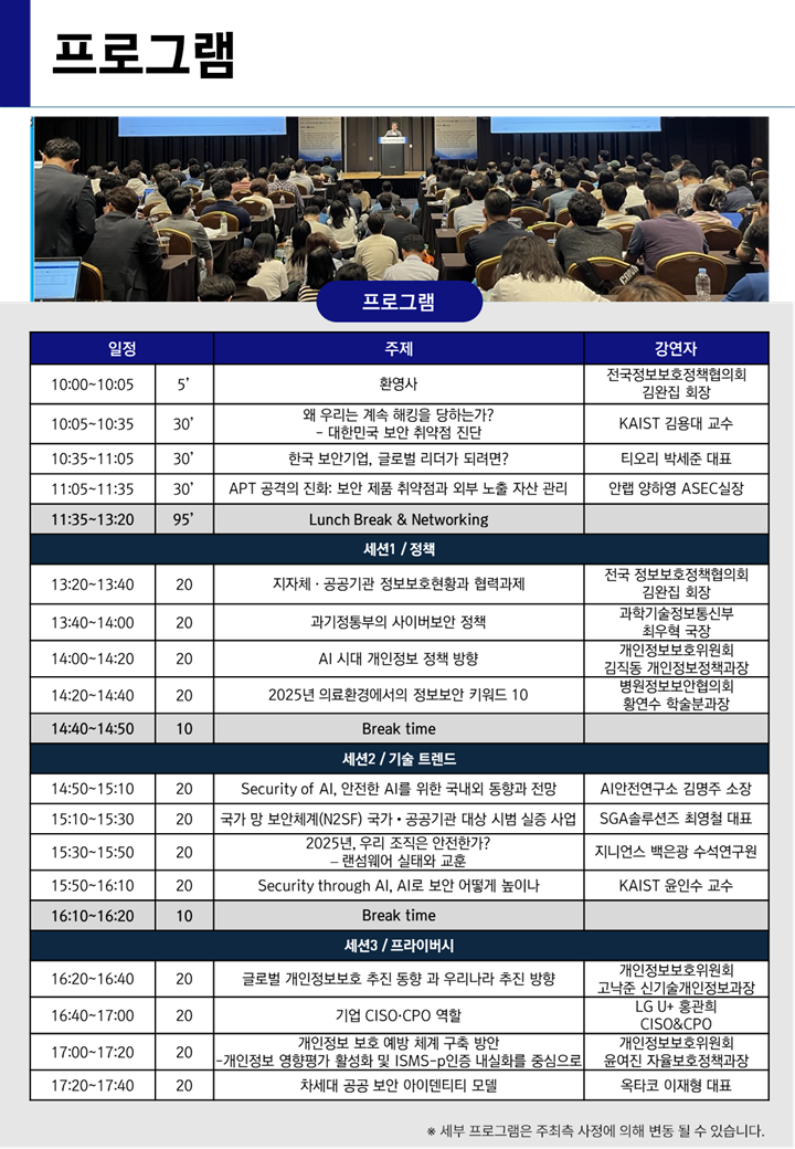 ZDnetKorea, 전국정보보호정책협의회와 AI페스타 조직위원회에서 자세한 행사 내용은 첨부된 자료를 다운로드 하시어 참고하시기 바랍니다. ○ 행사 일시 : 2025년 9월 30일(화) 오전 10시 ~ 오후 5시 40분 ○ 행사 장소 : 서울 코엑스 401호(4층) ○ 문의처 : ZDnetKorea 김동욱 차장 (02.330.0171. / dwkim@zdnet.co.kr)