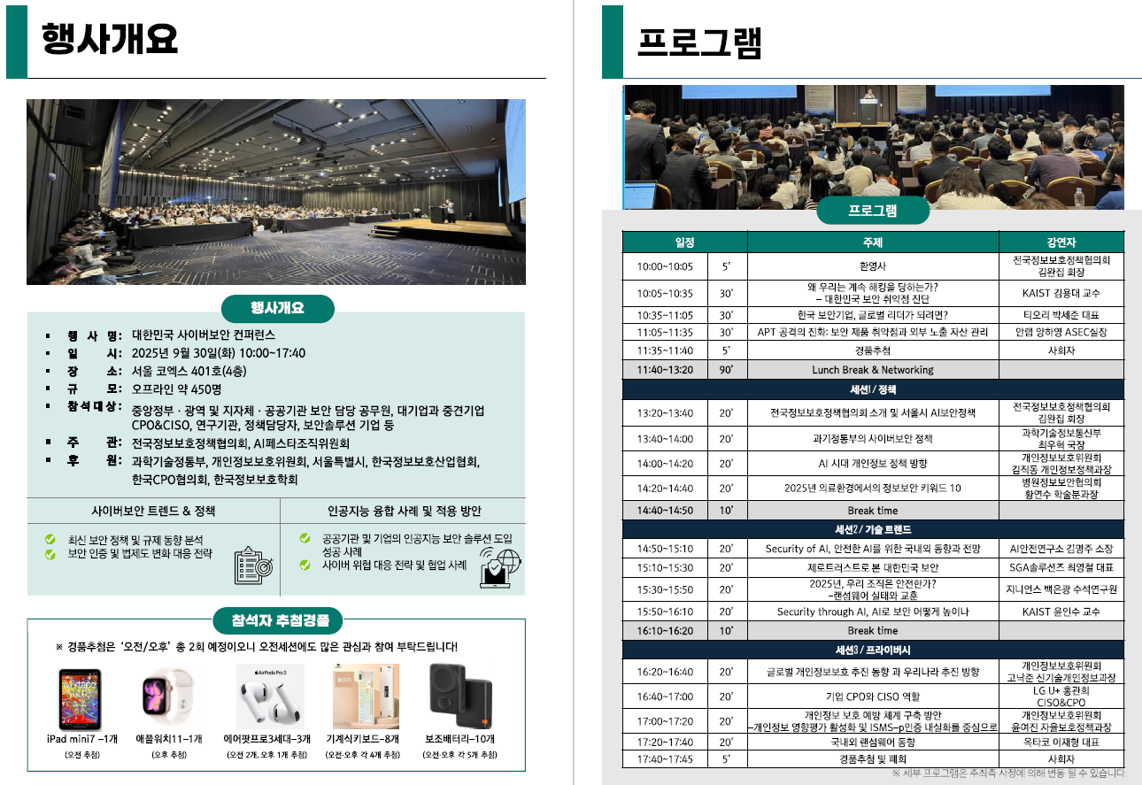 □ 「대한민국 사이버보안 컨퍼런스」행사개요 ○ 일 시 : '25. 9. 30.(화) 10:00 ~ 17:40 ○ 장 소 : 강남 코엑스 컨퍼런스룸 401호 (4층 / 서울특별시 강남구 영동대로 513) ○ 참석대상 : 중앙정부·광역 및 지자체·공공기관 보안 담당 공무원, 대기업과 중견기업 CPO&CISO, 연구기관, 정책담당자, 보안솔루션 기업 등 ※ 교육시간 7시간 인정 / 추첨 경품(아이패드 미니, 애플워치, 에어팟, 기계식 키보드 등) 제공 ○ 주요정책 : 정책 및 기술 트렌드, 프라이버시 관련 기조연설 및 세션 운영