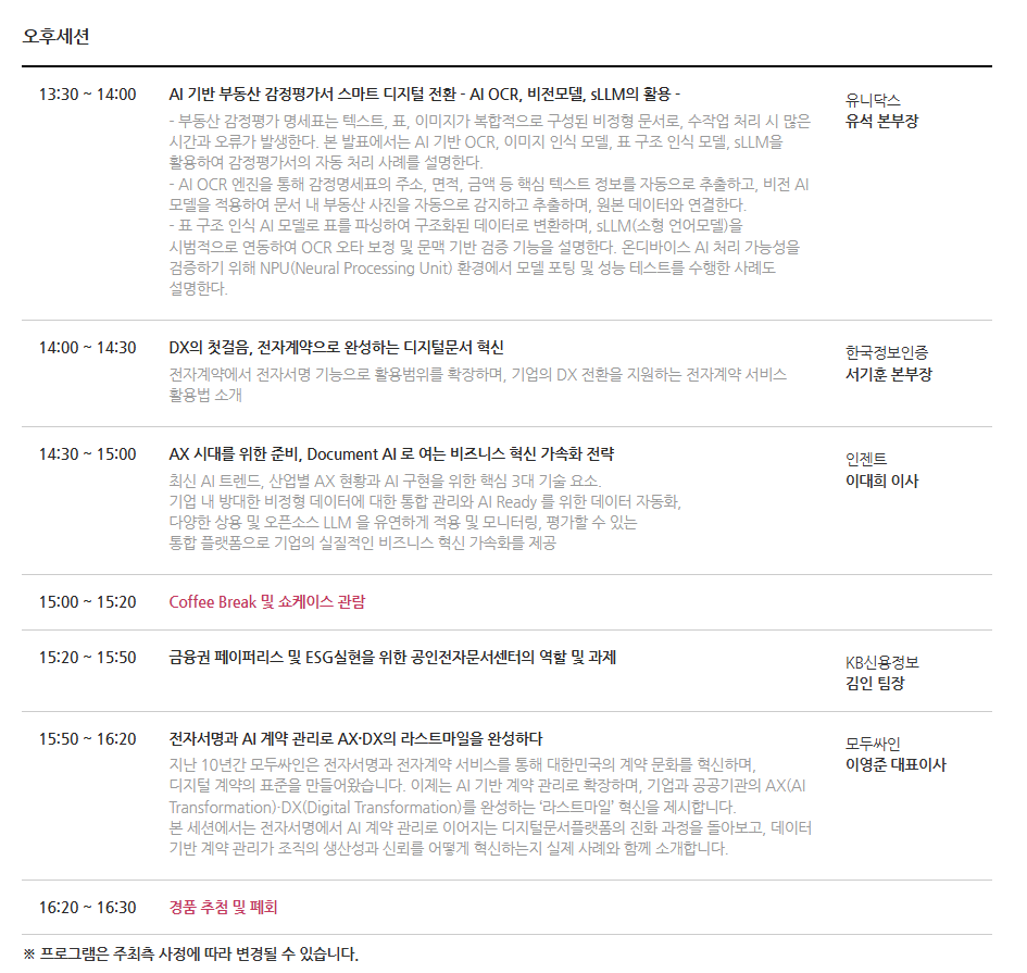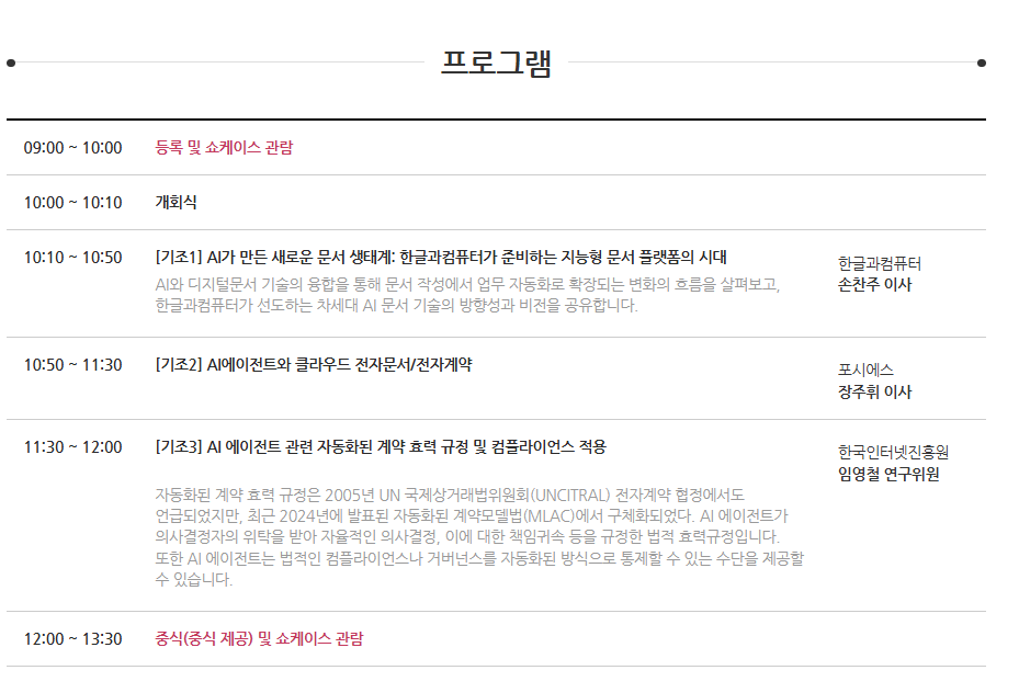 [행사개요] - 행사명: 디지털문서 플랫폼 컨퍼런스 2025 - 주제: AX/DX starts with Digital Document Platform - 장소: 엘타워 6F 그레이스홀 (서울시 서초구 강남대로 213번지 엘타워) - 참가대상: ① 디지털문서 관련 전 산업계 기업(기관) 임직원 ② 디지털문서 도입, 구축을 고민하는 전 산업계 임직원(전략기획, HR, 총무, 경영지원, 보안, 디지털, IT, 마케팅 부서 등) - 규모: 선착순 400명 - 참가비: 무료 (참가 대상자에 한함) * 사전 등록 후 최종 확인 메일을 받으신 분들에 한해 참석 가능합니다. * 사전등록마감: 2025년 11월 05일 (수) 17:00 * 사전등록링크: https://www.sek.co.kr/apply.php?sn=673 - 행사문의: 전자신문 홍선표 부장 (02-2168-9333, sekmaster@etnews.com)