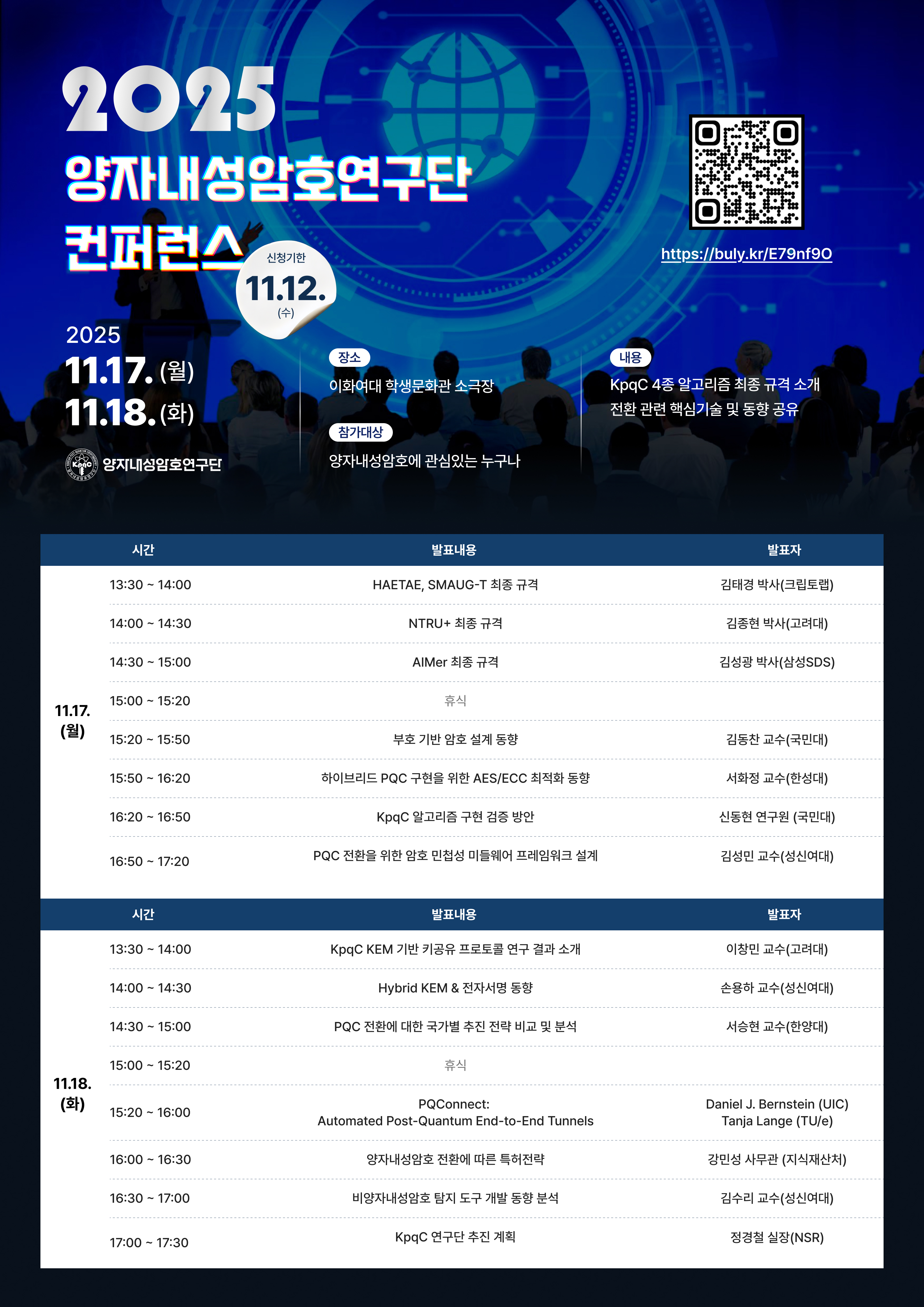 양자내성암호연구단에서 오는 11월 17일(월)–18일(화), 이화여자대학교 학생문화관 소극장에서 컨퍼런스를 개최합니다. 이번 컨퍼런스에서는 KpqC 4종 알고리즘의 최종 규격이 공개되며,