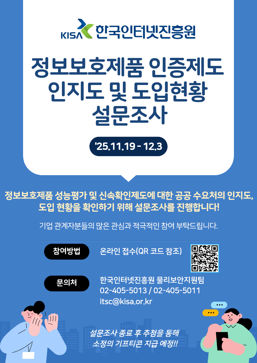한국인터넷진흥원에서는 "정보보호제품 인증제도 인지도 및 도입현황" 설문조사를 수행 중에 있습니다.