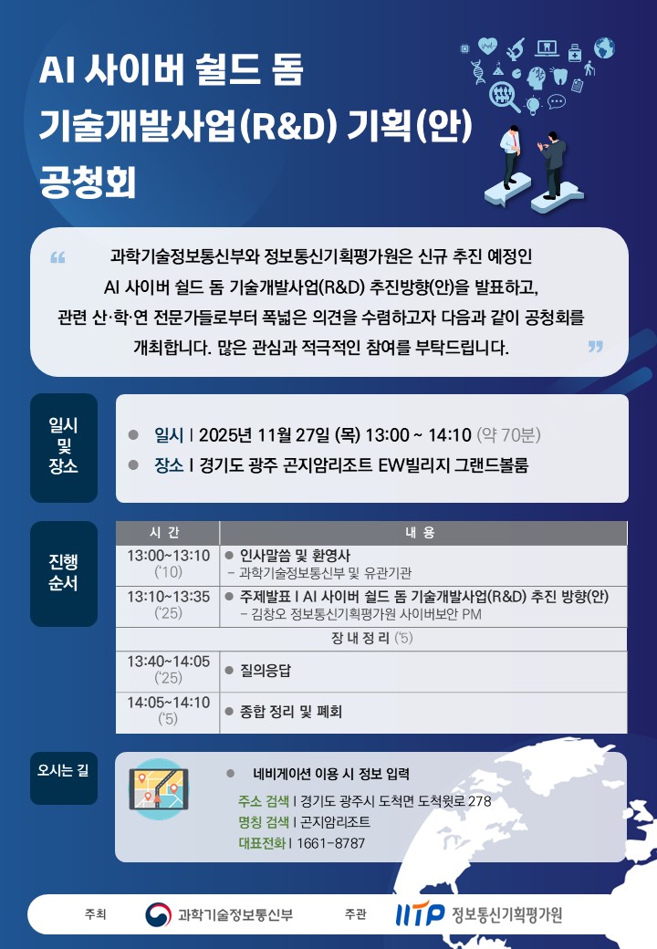 과학기술정보통신부와 정보통신기획평가원은 신규 추진 예정인 AI 사이버 쉴드 돔 기술개발사업(R&D) 추진방향(안)을 발표하고 관련 산 · 학 · 연 전문가들로부터 폭넓은 의견을 수렴하고자 다음과 같이 공청회를 개최합니다. 많은 관심과 적극적인 참여를 부탁드립니다.