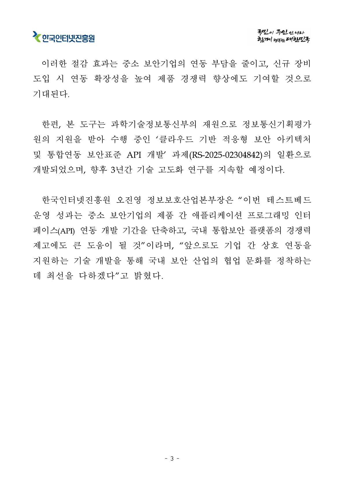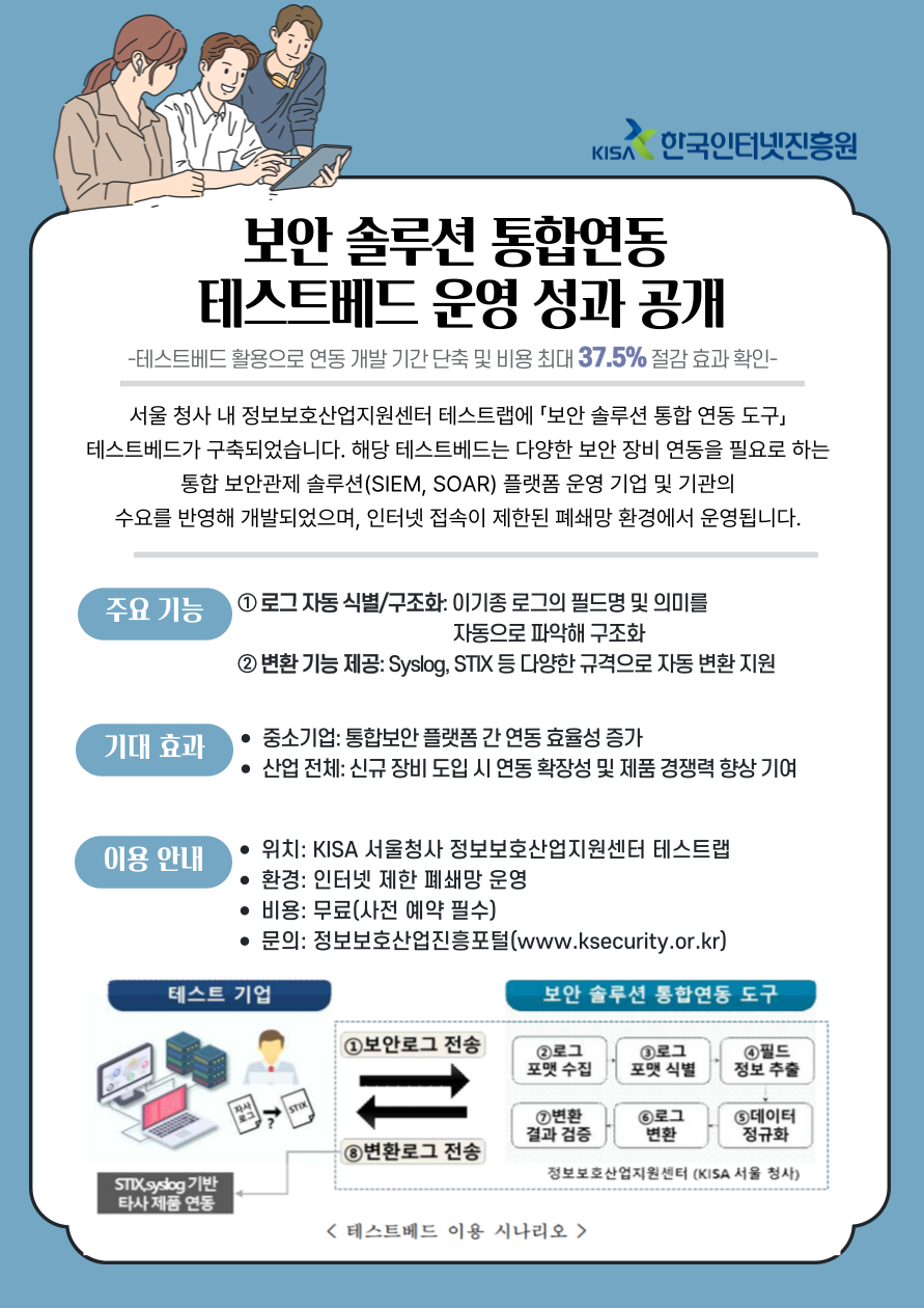 보안 솔루션 통합연동 테스트베드 운영 성과 공개 서울 청사 내 정보보호산업지원센터 테스트랩에 「보안 솔루션 통합 연동 도구」테스트베드가 구축되었습니다.