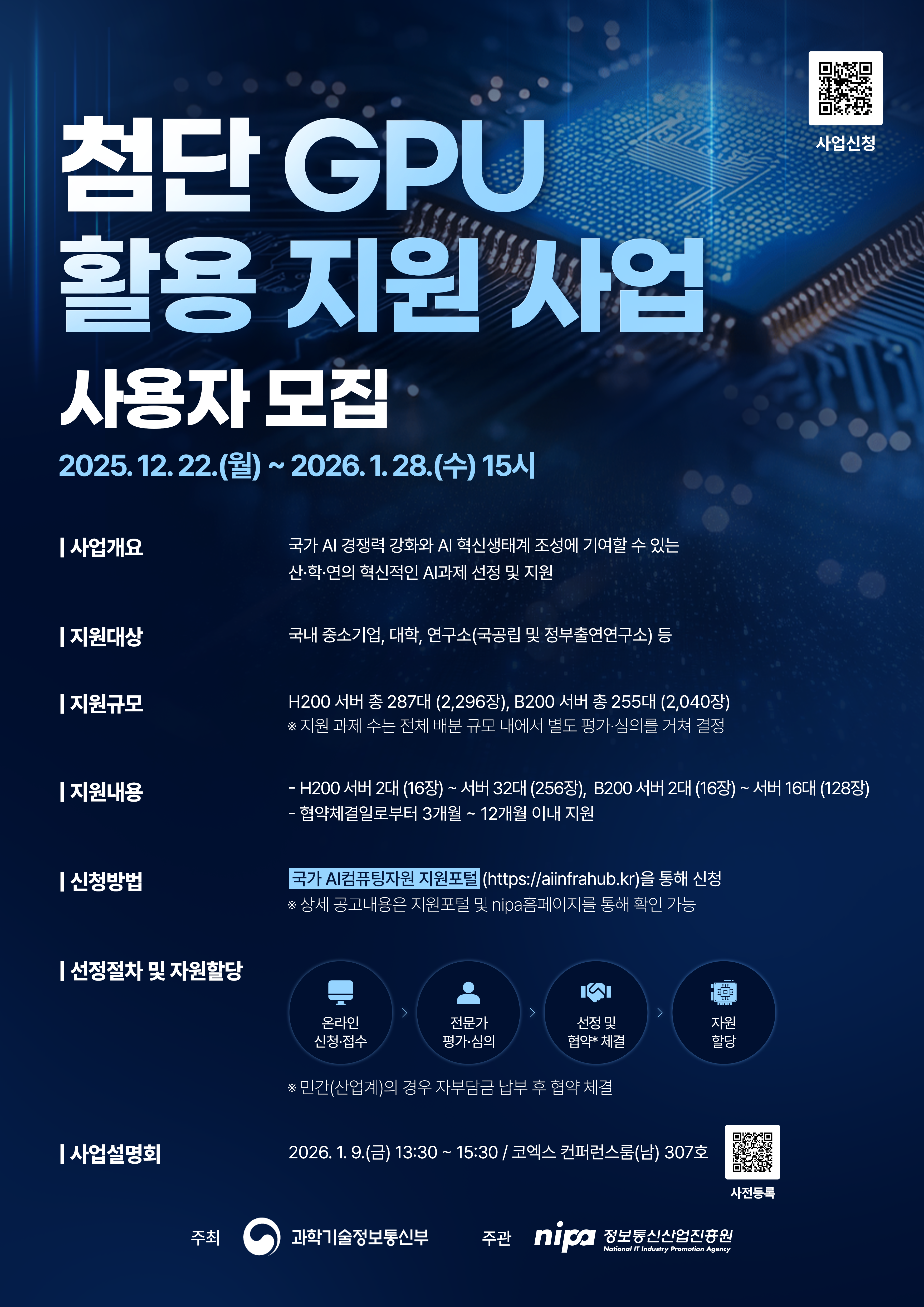 과학기술정보통신부 공고 제2025-1067호 과학기술정보통신부와 정보통신산업진흥원은 국가 AI 경쟁력 강화를 위해 대규모로 구축된 첨단 GPU 자원을 활용하여, 산·학·연의 혁신적인 AI 연구 및 서비스 개발을 지원하고자 「첨단 GPU 활용 지원 사업」의 사용자를 모집하오니 많은 관심과 참여를 바랍니다.