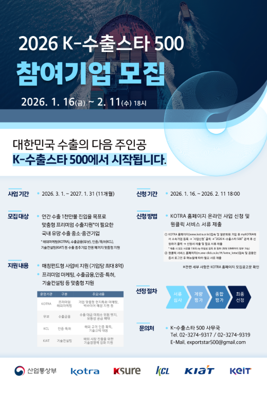 | 제목 | [KOTRA] 2026 K-수출스타500 사업 참여기업 모집 안내(~1. 31.(토)) | ||||||||||||||||||||||||||||||||||||||||||||||||||||||||||||||||||||