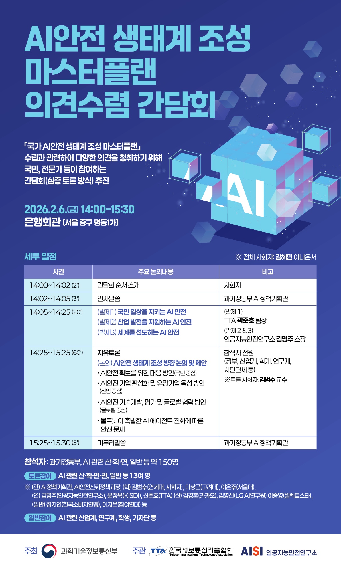 - 행사일시: 2026. 2. 6.(금) 14:00-15:30 - 행사장소: 은행회관(서울 중구 명동1가) - 주최기관: 과학기술정보통신부 - 주관기관: 한국정보통신기술협회, 인공지능안전연구소