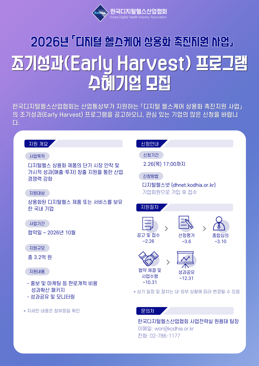 디지털 헬스 상용화 제품 시장 안착에 관심 있는 기업의 많은 참여를 바랍니다. o 기간 : 협약일 ~ 2026년 10월 o 접수기간 : '26. 2. 9.(월) ~ '26. 2. 26(목) 17시 o 접수방법 : 디지털헬스넷에서 기업회원 가입 후 접수 o 대상 : 상용화된 디지털헬스 제품 또는 서비스를 보유한 기업 o 주요내용 : 디지털헬스 상용화 직접비 지원 및 매칭데이 등 성과확산 패키지 지원 o 문의처 : KoDHIA 사업전략실 원용태 팀장 (02-786-1177 / won@kodhia.or.kr)