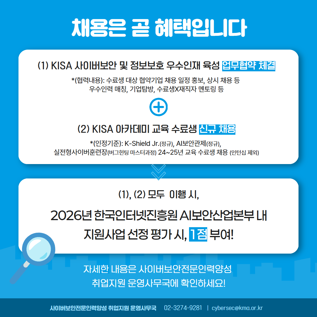 ■ 2026 KISA 지원사업 선정기업 모집 및 평가 반영 안내 ㅇ KISA 지원사업 선정 평가 시, KISA 업무협약 체결 기업 & KISA 아카데미 교육 수료생 채용한 기업에 대해 서류평가(1단계)에서 배점 내 점수 부여 • 평가항목: KISA 사이버보안 및 정보보호 우수인재 육성 협약 여부 & KISA 아카데미 24~25년도 교육 수료생 채용 여부 • 배점: 1점 - 업무 협약 기업이면서, 채용 실적이 인정되는 교육생을 채용한 경우에 한함 ㅇ 2026년 KISA 지원사업 선정기업 모집 공고문 ① 공고명: 2026년 양자내성암호 시범전환 사업 - 공고 바로가기: https://www.kisa.or.kr/401/form?postSeq=3592&page=1 ② 공고명: 2026년 제로트러스트 도입 시범사업 - 공고 바로가기: https://www.kisa.or.kr/401/form?postSeq=3601&page=1 ③ 공고명: 2026년 통합보안 모델 개발 시범사업 - 공고 바로가기: https://www.kisa.or.kr/401/form?postSeq=3600&page=1 ④ 공고명: 2026년 AI 보안 유망기업 육성 지원사업 참여기업 - 공고 바로가기: https://www.kisa.or.kr/401/form?postSeq=3599&page=1 --------------------------------------------------------- 산업 분야 우수인재 양성 및 사이버보안 산업계 진출 확대를 위한 본 신규 인센티브 도입 방안과 업무 협력 활성화에 많은 관심과 참여를 부탁드립니다.