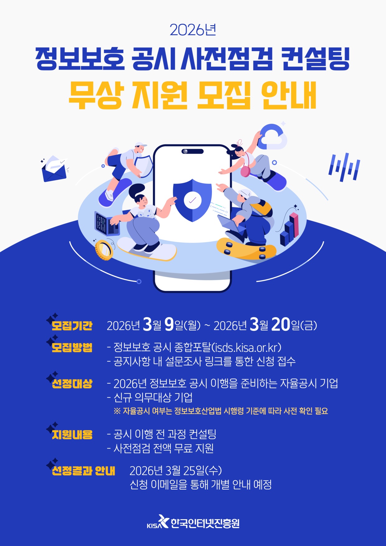 o 지원내용 : 공시 이행 전 과정에 대한 컨설팅 및 정보보호 공시 사전점검 지원(전액 무료) o 선정결과 안내 : 2026년 3월 25일(수), 신청 이메일을 통해 개별 안내 예정
