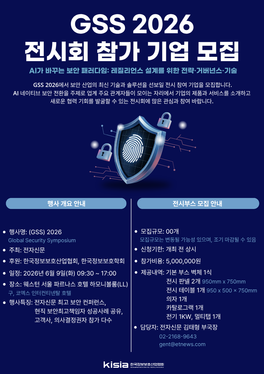전자신문은 오는 6월 9일 'GSS 2026'에서 'AI-네이티브 보안 전환-사이버 레질리언스를 설계하라!'를 주제로, AI 확산 이후 변화하는 보안 투자 흐름과 실행 전략을 체계적으로 조망하고자 합니다. 단순한 기술 소개의 장이 아니라, AI 시대 보안 투자와 운영 전략을 논의하는 실질적 비즈니스 플랫폼으로 마련될 예정입니다. 이에 본 행사에 참여할 전시 부스 참가 기업을 모집하오니 많은 관심과 참여 부탁드립니다.