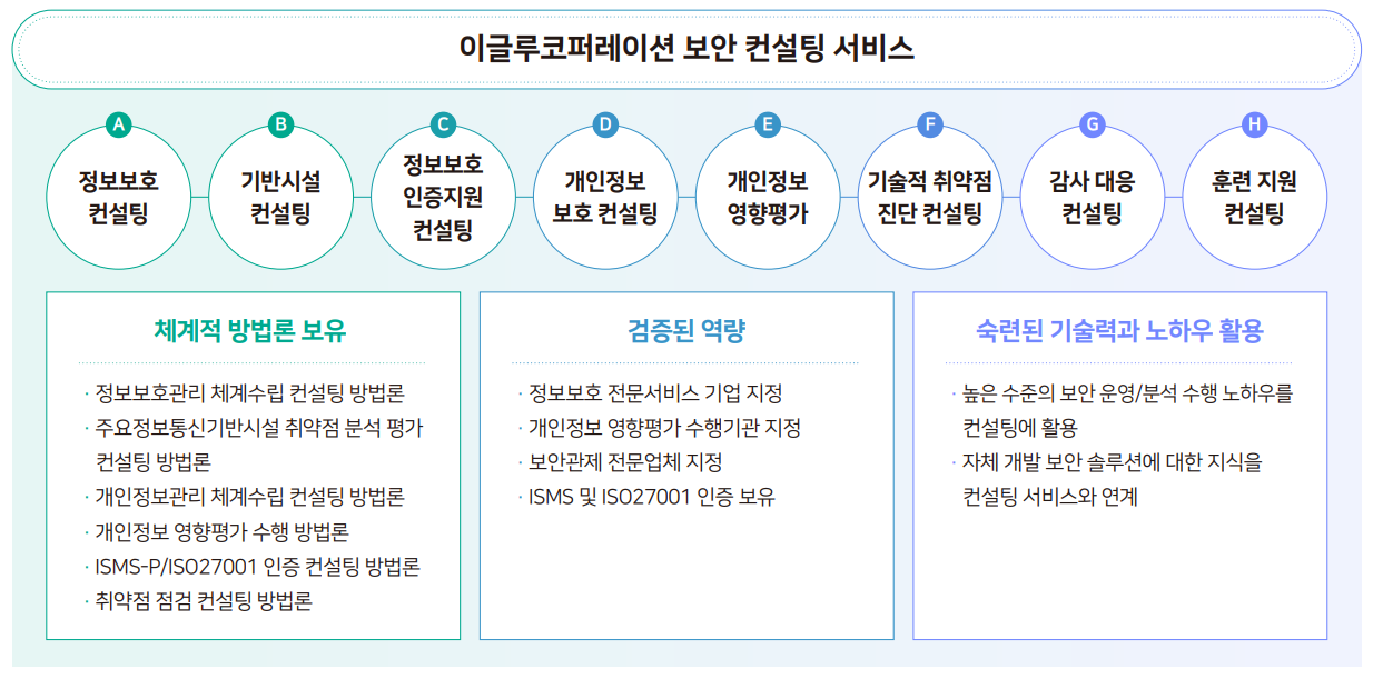 |  | Security Consulting 정보보호 전문서비스 기업으로써 독자적인 방법론을 바탕으로 조직의 정보자산을 안전하게 보호하기 위해 다양한 보안 인증 컨설팅과 모의해킹, 클라우드 보안 컨설팅 등 다양한 정보보호 컨설팅 서비스를 제공합니다. | |||