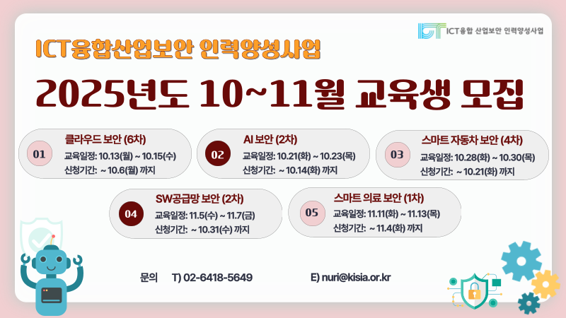 | 제목 | [모집중] 2025 ICT융합산업보안 인력양성사업 10,11월 교육생 | ||