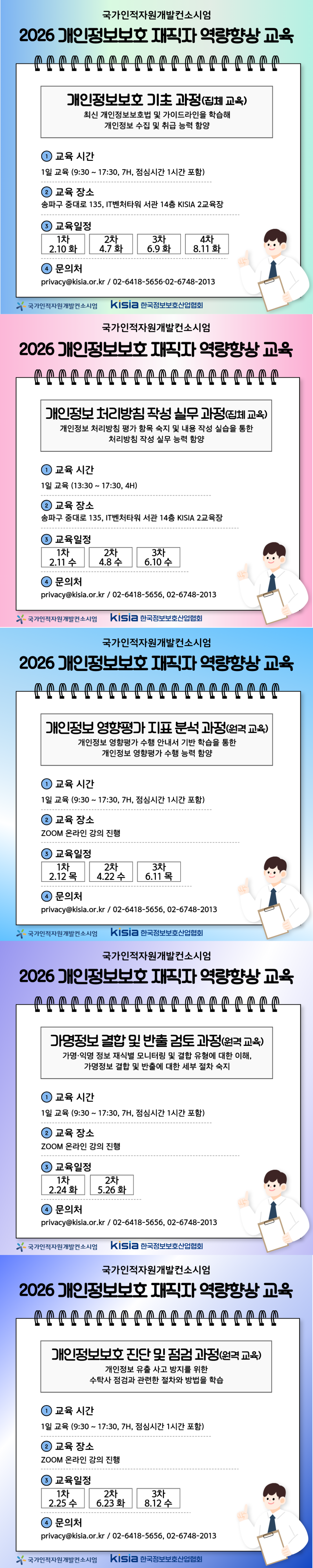 안녕하세요 한국정보보호교육원 사무국입니다 2026년 새해가 다가오고있습니다. 모두 새해복 많이 받으시기 바랍니다. 신년을 맞아 새롭게 선보이는 개인정보보호 국가인적자원개발컨소시엄 2월 재직자 교육생을 모집합니다. 해당 과정은 구글폼을 이용한 설문지로 교육 신청을 접수할 예정이오니, 아래의 링크를 통해 신청해주시기 바랍니다. ◎ 훈련 장소 - 집체: 한국정보보호산업협회 교육장(서울시 송파구 중대로 135 IT벤쳐타워 서관 14층) - 원격: zoom 링크 ◎ 훈련 대상 : 협약기업 재직자 20~25명(선착순 마감될 수 있으니, 빠른 신청 바랍니다) ◎ 교육비용 : 무료(대규모기업은 20%자부담금 발생) ◎ 교육 신청 링크: https://forms.gle/Vtm9B2joxK38vos78