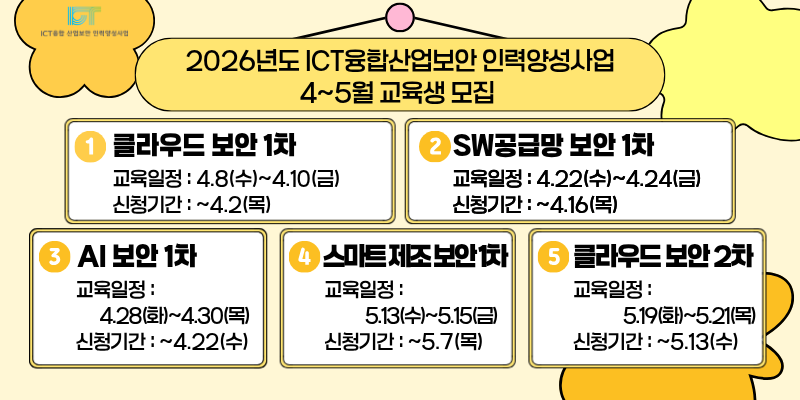 2026년도 ICT융합산업보안 인력양성사업 4, 5월 교육생을 모집합니다.
