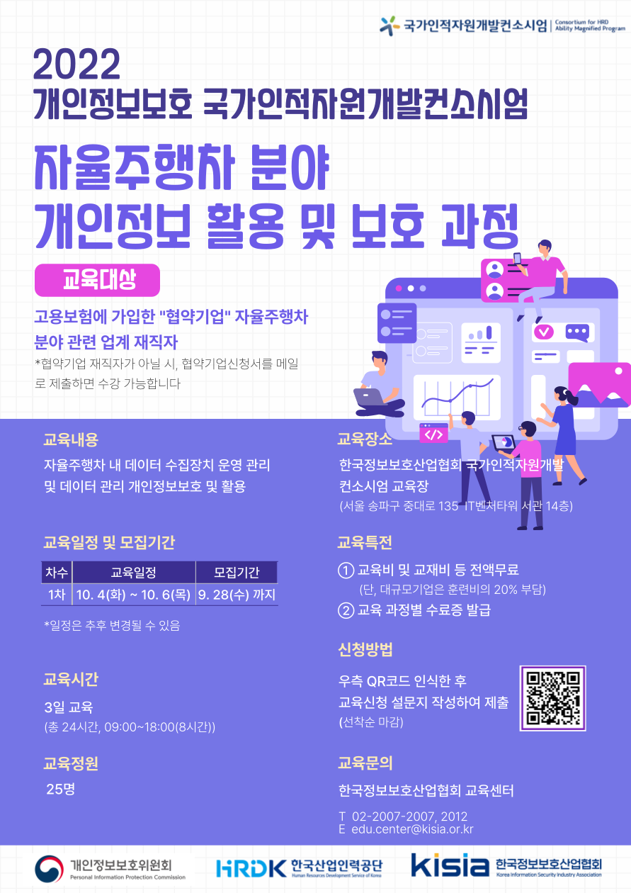 자율주행차 분야 개인정보 활용 및 보호 과정 교육생을 9월 30일(금)까지 모집합니다.