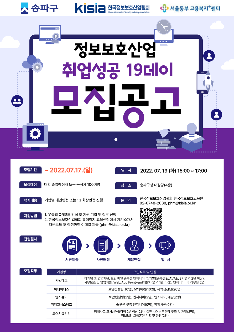 ✔ 모집기간 : ~7. 17(일) 까지 ✔ 모집대상 : 대학졸업예정자 또는 구직자 ✔ 면접일시 : 2022. 07. 19.(화) 15:00 ~17:00 ✔ 면접장소 : 송파구청 대강당(4층) ✔ 신청방법 : QR코드로 원하는 기업 및 직무 신청 → 자기소개서 작성하여 이메일 제출(phm@kisia.or.kr) ✔ 자기소개서 : 정보보호산업 취업성공 19데이 자기소개서_000 ✔ 이메일 제출 : phm@kisia.or.kr
