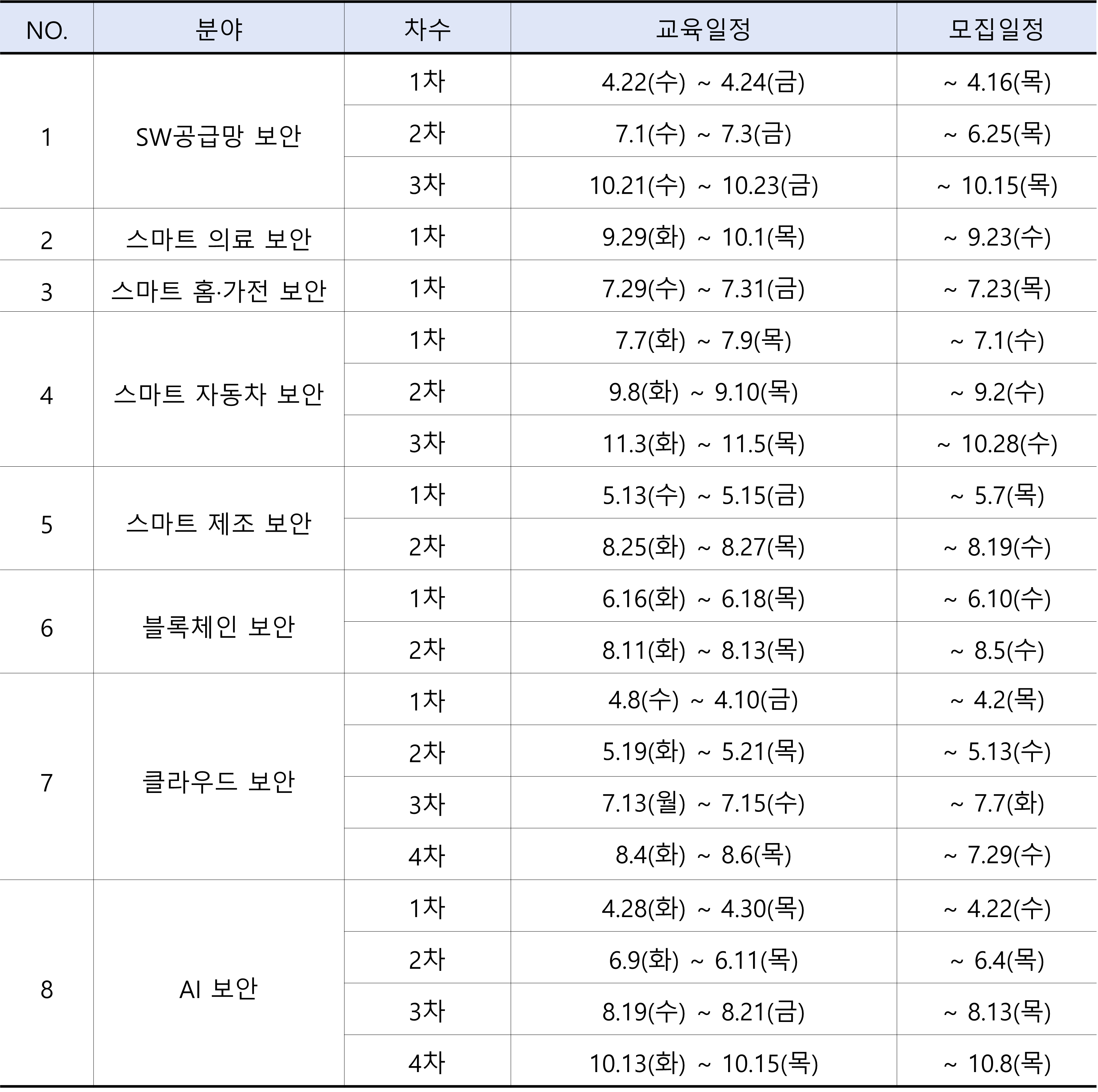 스마트 자동차 · 스마트 제조 · 스마트 홈·가전 · 스마트 의료 · 블록체인 · 클라우드 · SW공급망 · AI보안 등 총 8개 분야 전문 교육 |